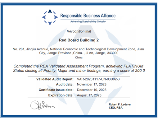 江西紅板科技股份有限公司于2019年首次獲得RBA認證,鉑金等級(得分:200,總分:200),體現紅板在社會責任方面的重視和付出。紅板承諾會一如既往地滿足RBA認證要求,重視社會責任,持續改善在社會責任方面的績效。