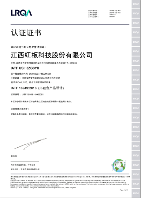 江西紅板科技股份有限公司于2009年正式獲得IATF16949體系證書,經過多年的持續改善,已能有效的保證汽車用的線路板的品質,提升客戶滿意度。