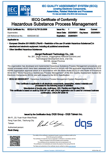 江西紅板科技股份有限公司于2020年正式獲得QC080000體系證書,將持續滿足相關方及相關法律法規的要求,并持續推動管理體系在組織內的運用。