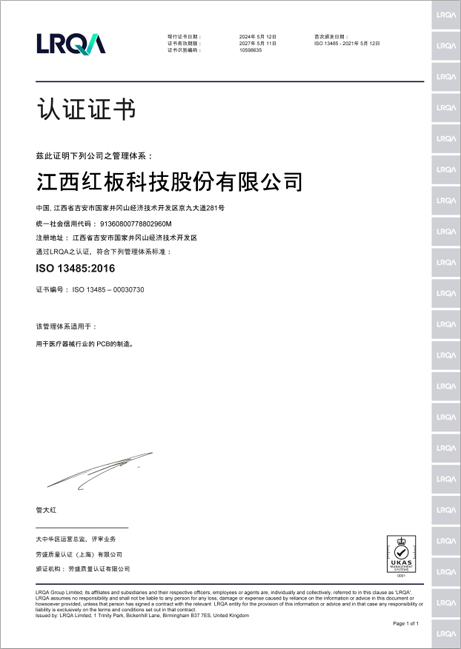 江西紅板科技股份有限公司于2021年正式獲得ISO13485體系證書,持續滿足客戶要求和適用的法規要求,并持續推動管理體系在組織內的有效運用。