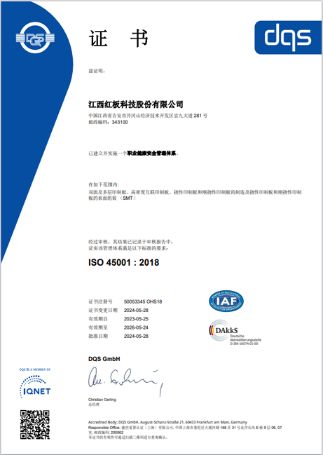 江西紅板科技股份有限公司于2020年正式獲得ISO45001體系證書,公司承諾將持續為公司員工創建安全、衛生的工作環境和生活環境,確保法律法規的符合性,持續改進職業健康安全績效,承擔一個高新技術企業的應有的社會責任。