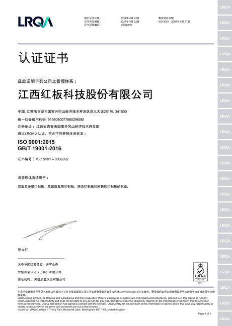 江西紅板科技股份有限公司于2009年正式獲得ISO9001體系證書,經過多年的體系運行,整個質量管理體已趨近完善,各部門的績效指標也已經實現持續提升,輸出的產品品質能確保獲得客戶滿意。