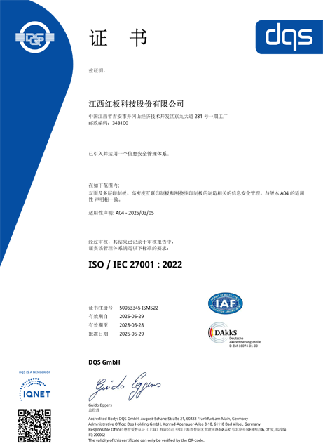 江西紅板科技股份有限公司于2020年正式獲得ISO/IEC 27001體系證書,持續有效保護公司信息安全和客戶產品信息。